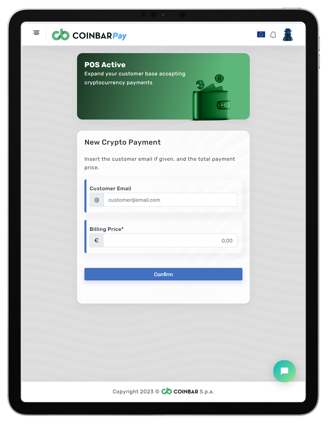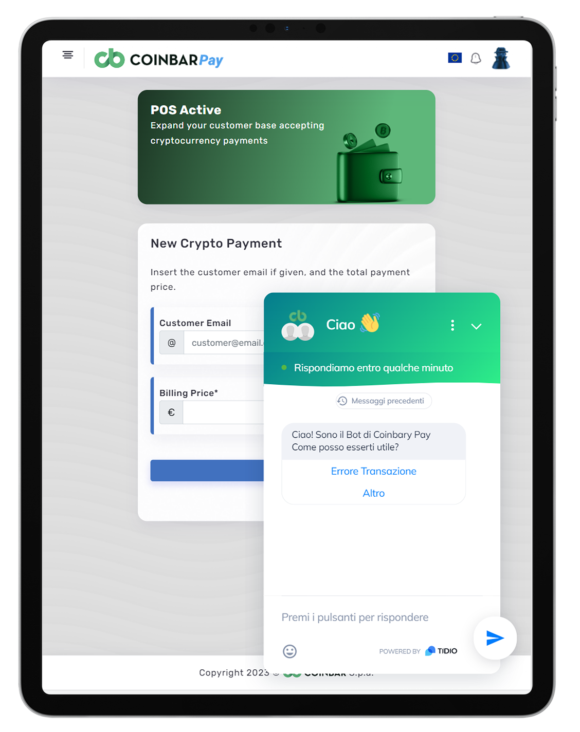 * <mark style="color:blue;">**Customer Email:**</mark> Please insert in this field the customer email if he/she wants to recieve a summary of the crypto purchase