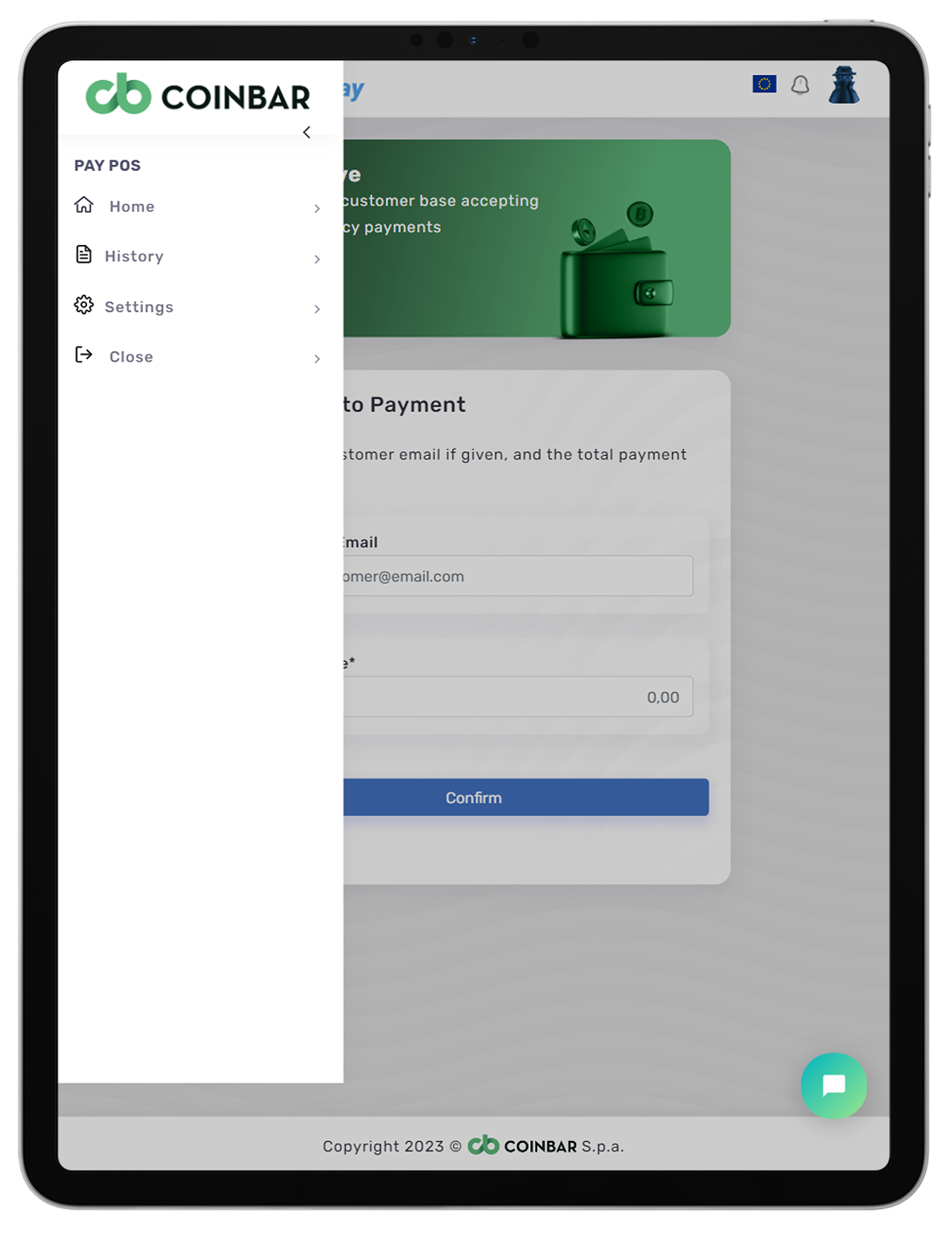 * <mark style="color:blue;">**History:**</mark> the history button helps you to have a detailed [**transaction data and reports**](https://docs.coinbar.io/point-of-sale/transactions-and-reports)